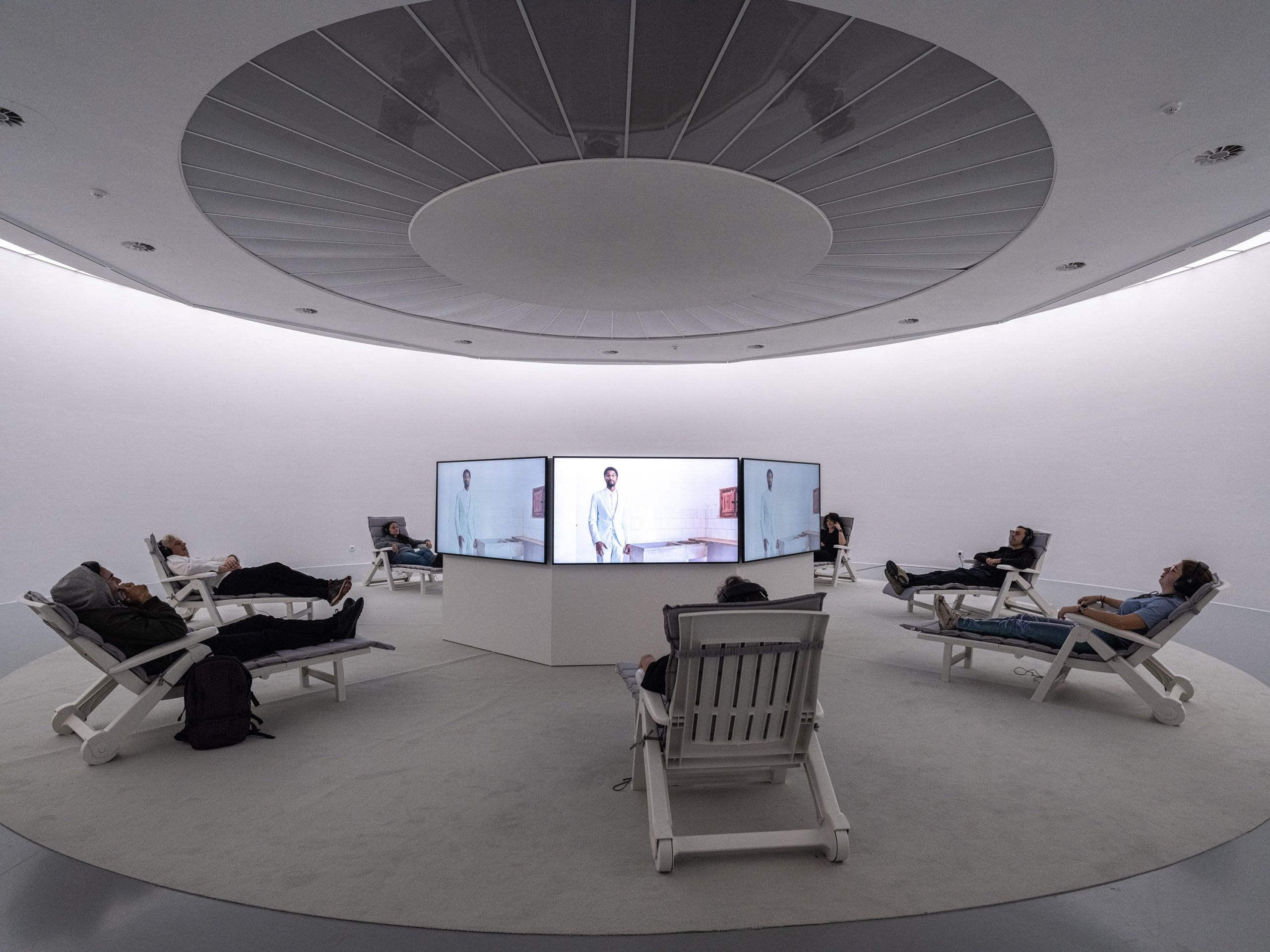 The exhibition’s circular centerpiece—a set of reclined lounge chairs surrounding a multi-screen installation—adds another layer to Mosquito’s exploration of perspective and audience. Here, visitors are invited to sit back, lie down, and consume his visual narratives in a way more akin to a therapeutic or cinematic experience than a traditional gallery setup. This setting blurs the line between passive consumption and active reflection, creating a space where spectators are lulled into contemplation even as Mosquito’s characters confront them with provocative questions on society, stereotypes, power, and identity.