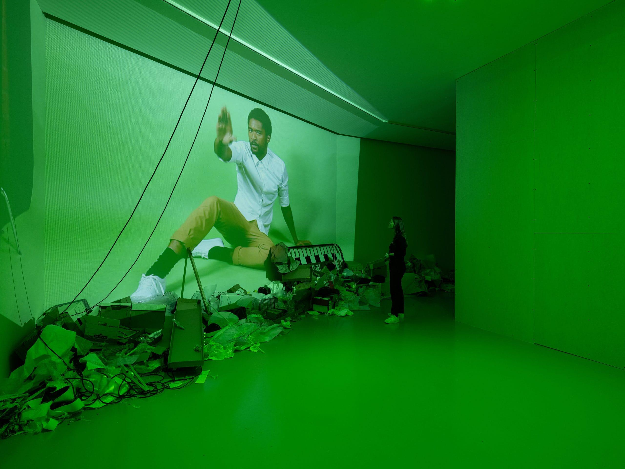 In another room, bathed in an unsettling green light, we encounter a giant projection of Mosquito himself, magnified and arresting. The debris strewn along the floor beneath the screen feels like the aftermath of a personal or cultural upheaval—a visual metaphor for Mosquito’s deconstruction of personas and beliefs. The juxtaposition of his larger-than-life figure with the mess below suggests that each persona he inhabits comes with consequences, urging us to consider the rubble left behind by discarded ideas and identities.