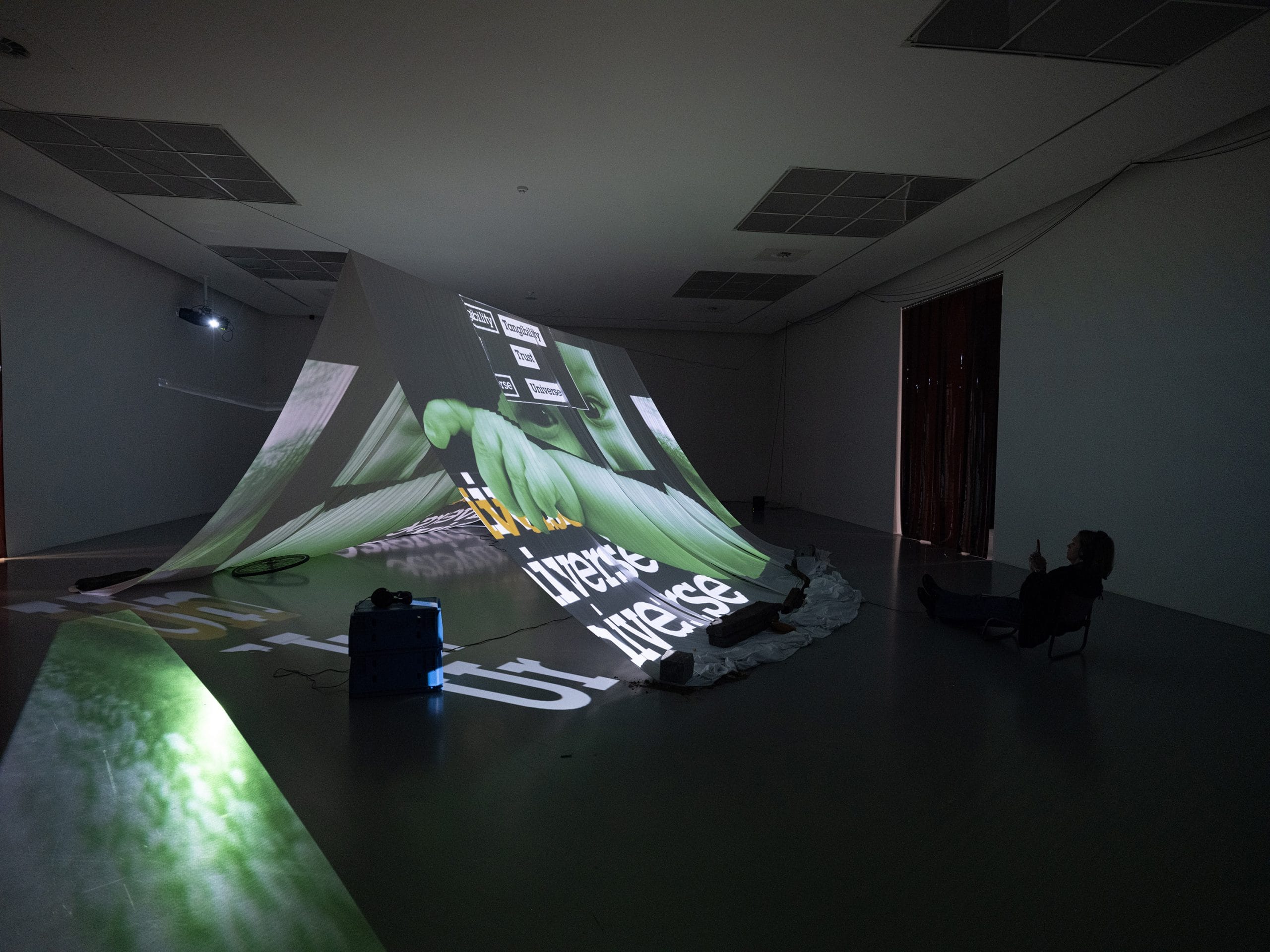 The exhibition space itself is intentionally disorienting. The first image captures a projection cascading over a tented fabric structure, suggesting a collapsing stage or distorted screen, inviting viewers to lean back and witness fragmented text and surreal visuals from a low angle. This uneven surface disrupts traditional viewing, creating an intimate, almost vulnerable encounter with Mosquito’s layered messages. This setup is as much about making viewers uneasy as it is about amplifying the artist’s themes: challenging narratives, disrupting norms, and breaking down the “correct” ways of seeing and understanding art.