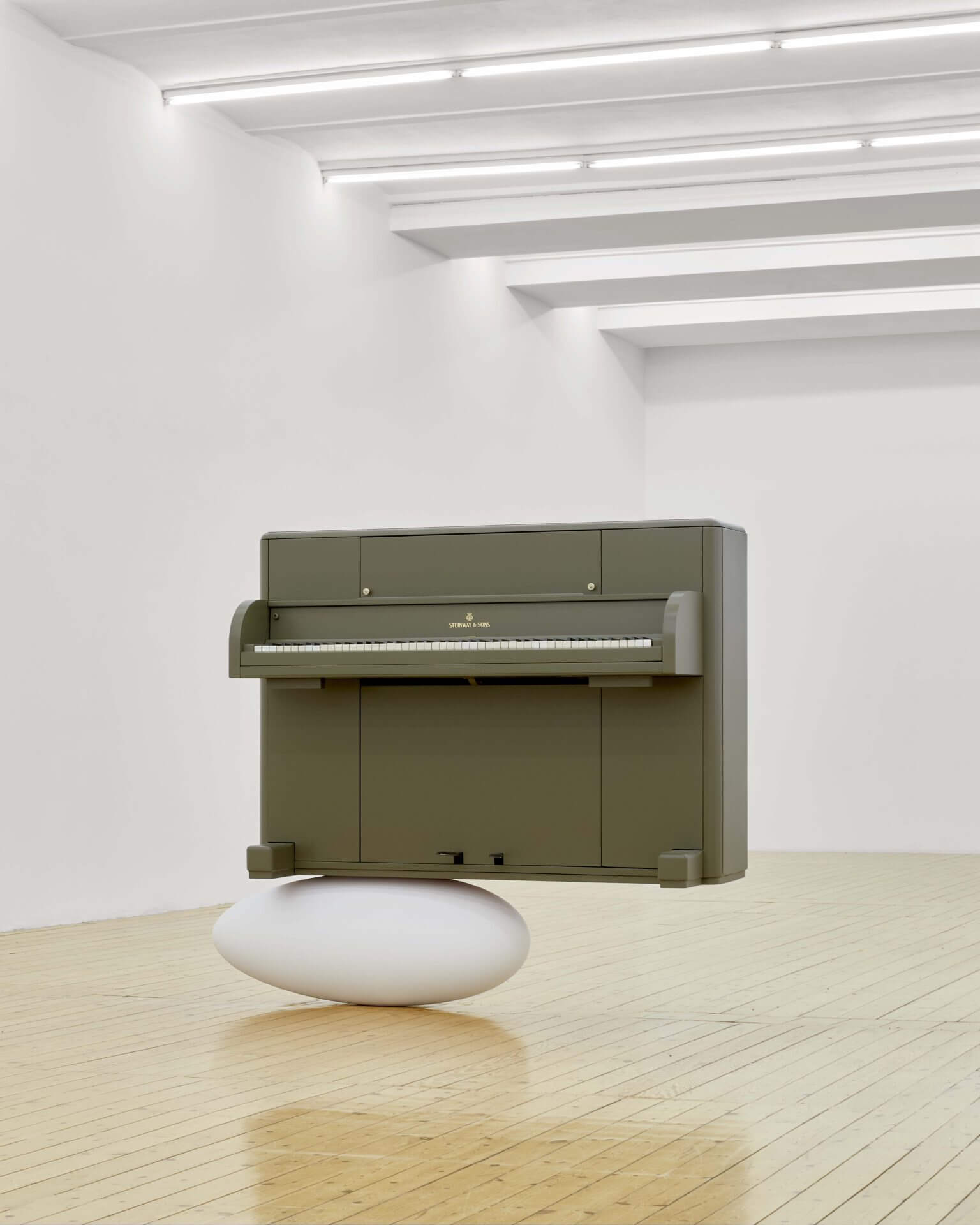 The first sight is almost unreal: a “Steinway Victory Vertical”, the legendary “G.I. Steinway”, restored yet stripped of its original role. Suspended, literally, above a white, child-sized cocoon. Born in 1942 to be shipped to the front, it now floats as if holding its breath, its wood darkened by age, its strings mute. Its history, built light, painted in olive drab, packed with tools and instructions for tuning under shellfire, presses into the mind as you look, yet its present is something else: no longer a diversion for soldiers far from home, but a fragile monument to what remains of an act of care amid destruction.
