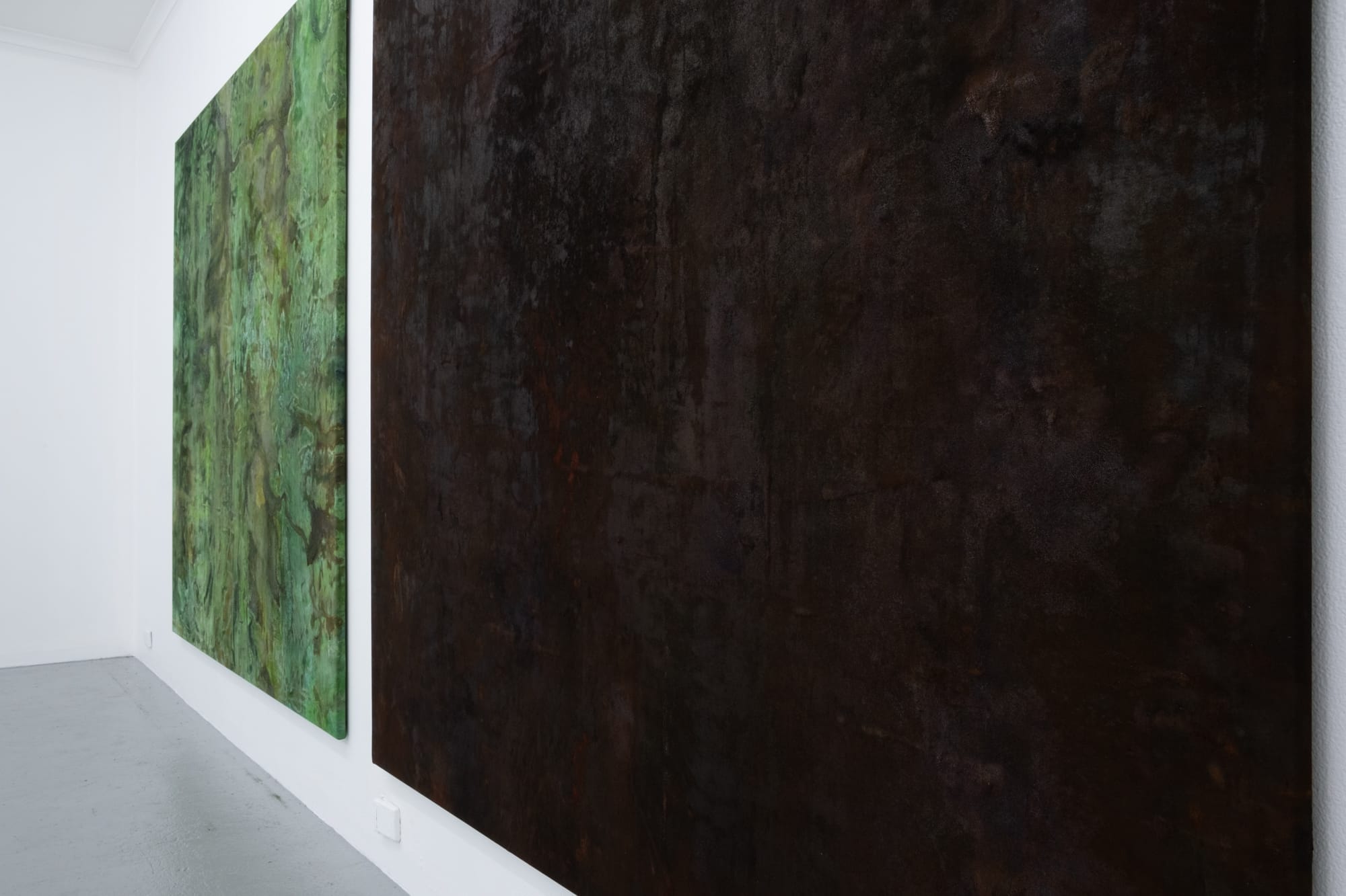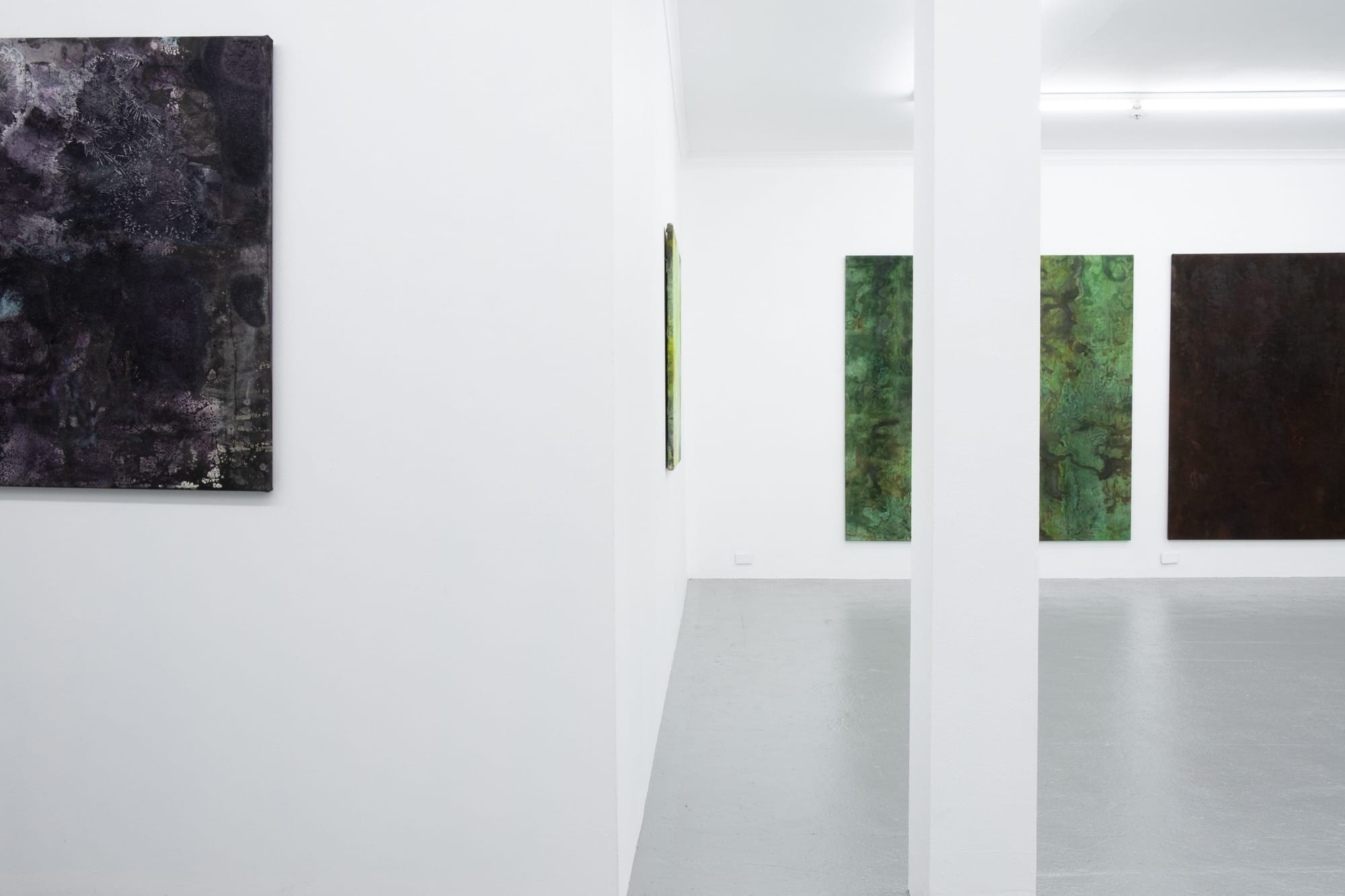 DIG consists of nine entropic paintings presented during their primordial metamorphic phase. Metals, pigments, acids and salts are combined together, terraforming the canvas in a complex chain of reactions. Non-human actions form the paintings; misting, eroding, pooling and streaming. They gradually shift and fragment as the chaotic systems seek equilibrium with their environment. Throughout the duration of the installation, the surface reactions eventually give way to inertia and time solidifies. The history of their evolution depicted in residue. Presented alongside these works is Heat Loss (Excerpts), a digital installation made in collaboration with digital artist Tristan Jensen with sound by Red Silk. Time-lapse footage of the paintings’ evolution brings to light the metamorphosis of the works in microscopic detail, condensing days of reactions into a window of entropic exchange.