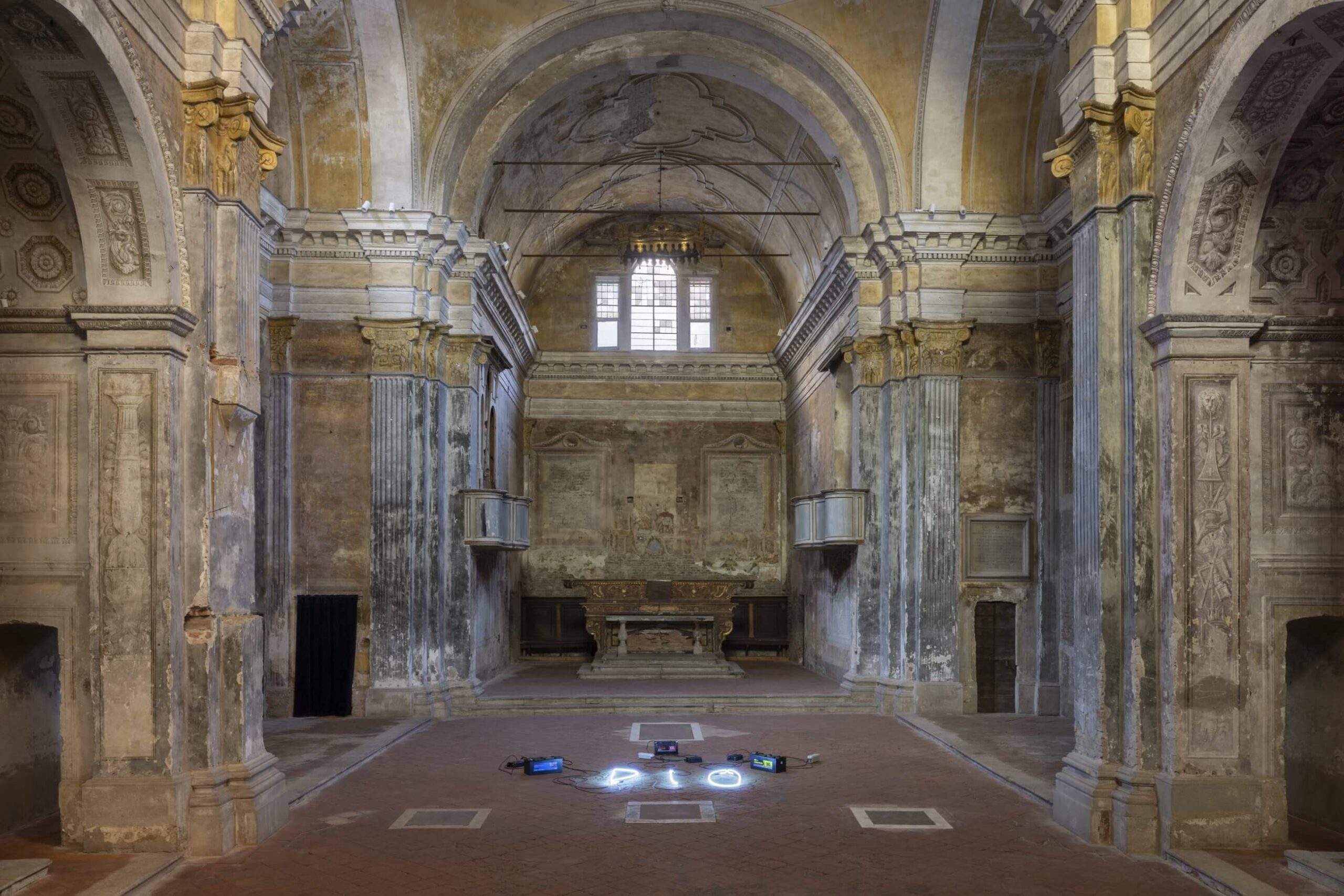 What remains of God when the word goes dark? We asked ourselves this as we stepped into San Carlo Church, welcomed by the cool breath of stone and the faint scent of worn plaster, like walking into an ancient memory. We must admit: the walls, chipped and solemn, seemed to be holding their breath. Then, at the center of the nave, something like a fragile apparition. “DIO” (God), traced in childlike handwriting, drawn in neon light, an idea so simple yet too immense to speak aloud. A word that lay on the ground as if it had fallen from above. We looked at each other: it was immediately clear this light wasn’t made to last. Powered by truck batteries, DIO a batteria, as Maloberti calls it, is an epiphany bound to extinguish. A precarious, vulnerable presence, silently asking us to keep watch.