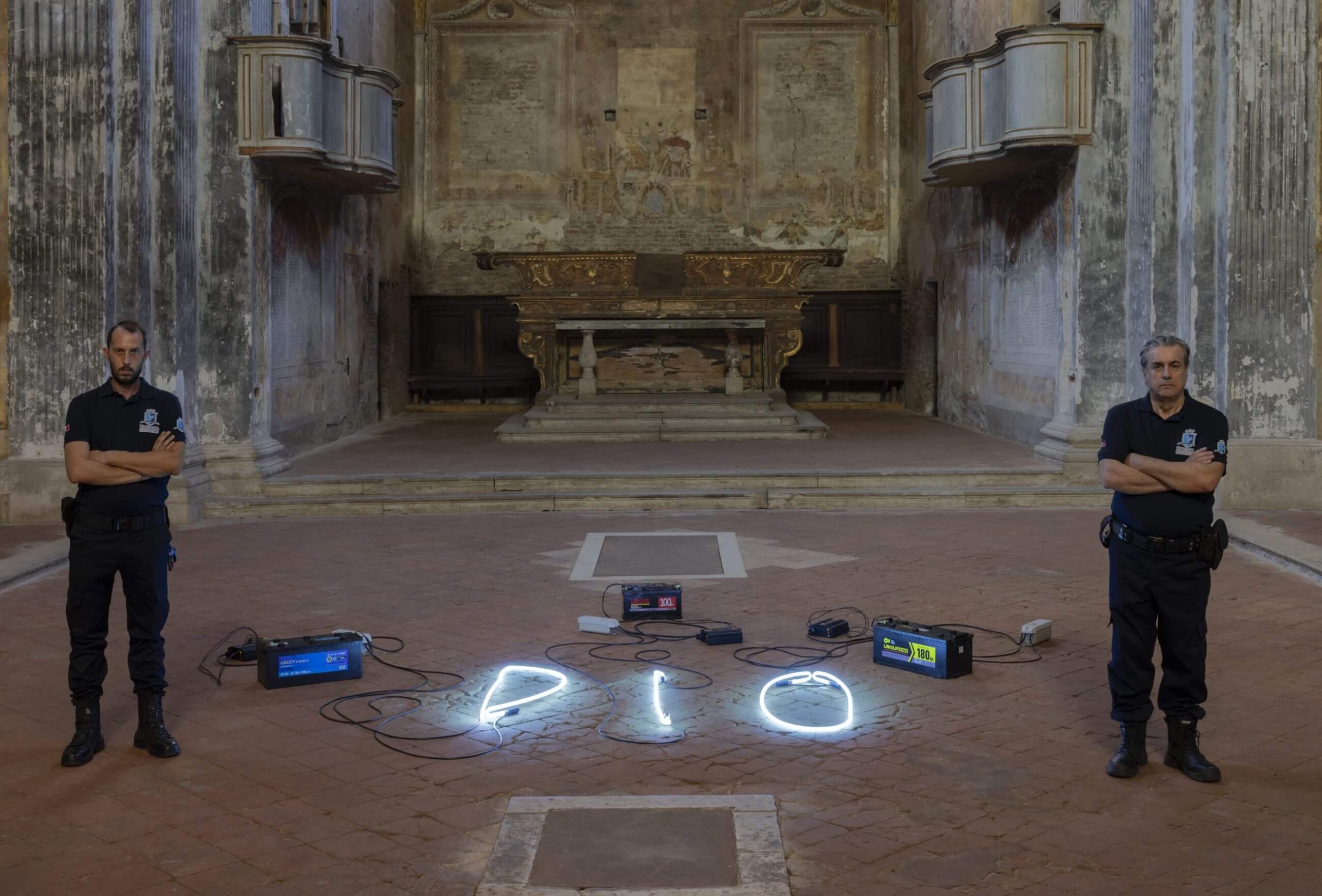 Maloberti shapes his DIO with simple gestures and humble materials. Neon tubes, rarefied gas, electric wires, transformed into a handwriting of light. The letters, awkward and human, reveal their childlike nature: hesitant curves, broken verticals, imperfections amplified in the fragile glass. Around them, industrial batteries rest on the ancient floor, interrupting the sacredness with the brute weight of reality. Heavy, numbered, opaque boxes. And yet, it’s these that keep the light alive. Chemical energy, tangible, finite, becomes temporary nourishment for the divine. This is where Maloberti’s work unfolds: the sacred not as something eternal, but as something that demands maintenance, care, vigilance.