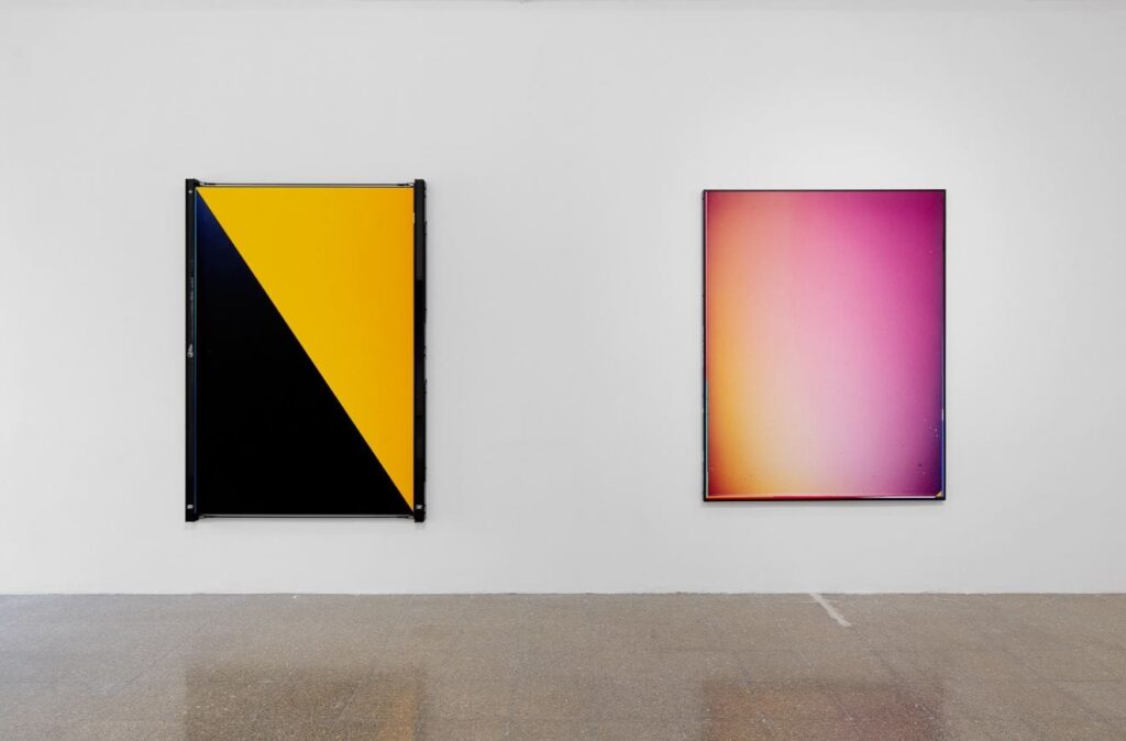 A new series, titled “It’s Time to Believe in Magic,” is displayed alongside the gradient color canvases for which Edmunds is known. These minimalist works, with flat, uninterrupted color blocks, recall the chromatic experiments of Ellsworth Kelly. Created with hand-dyed colors, the canvases are joined by heavy sculptural frames and elastic cords. Edmunds states, “I don’t fully understand them. They are exciting and unfamiliar to me, but I believe in them. They resemble nautical flags, designed for communication, but their messages are ambiguous.”