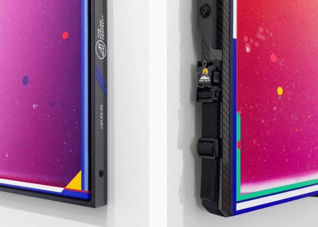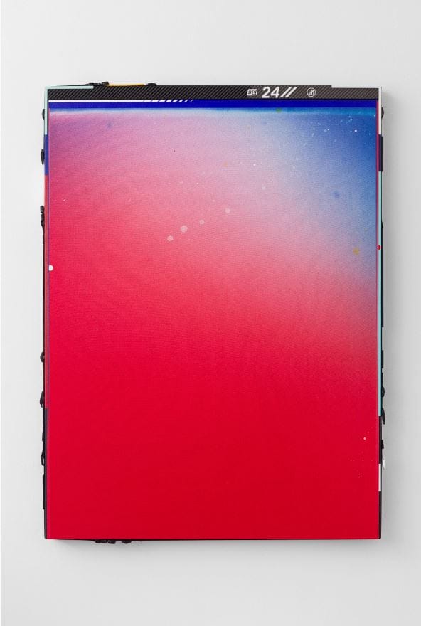 However, Edmunds enriches these surfaces with sculptural and graphic design interventions, integrating carbon fiber frames, elastic cords, and carabiners. These elements not only frame the works but also confer a strangely hybrid three-dimensionality, suggesting that the canvases might somehow be tools of adventure—devices for an experience, for a new reading of the painting medium.