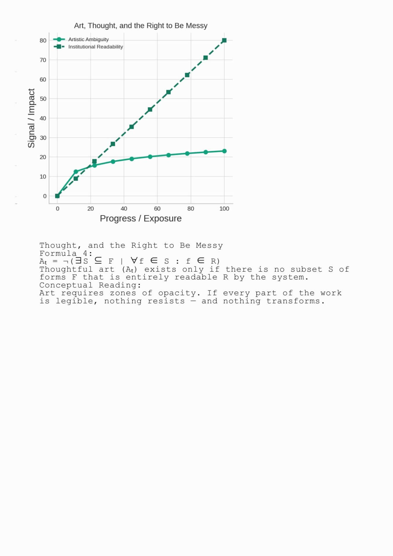 A return to the unresolved, the unstable, the illegible space in which intelligence, both artistic and cognitive, begins to form not in spite of failure, but because of it.