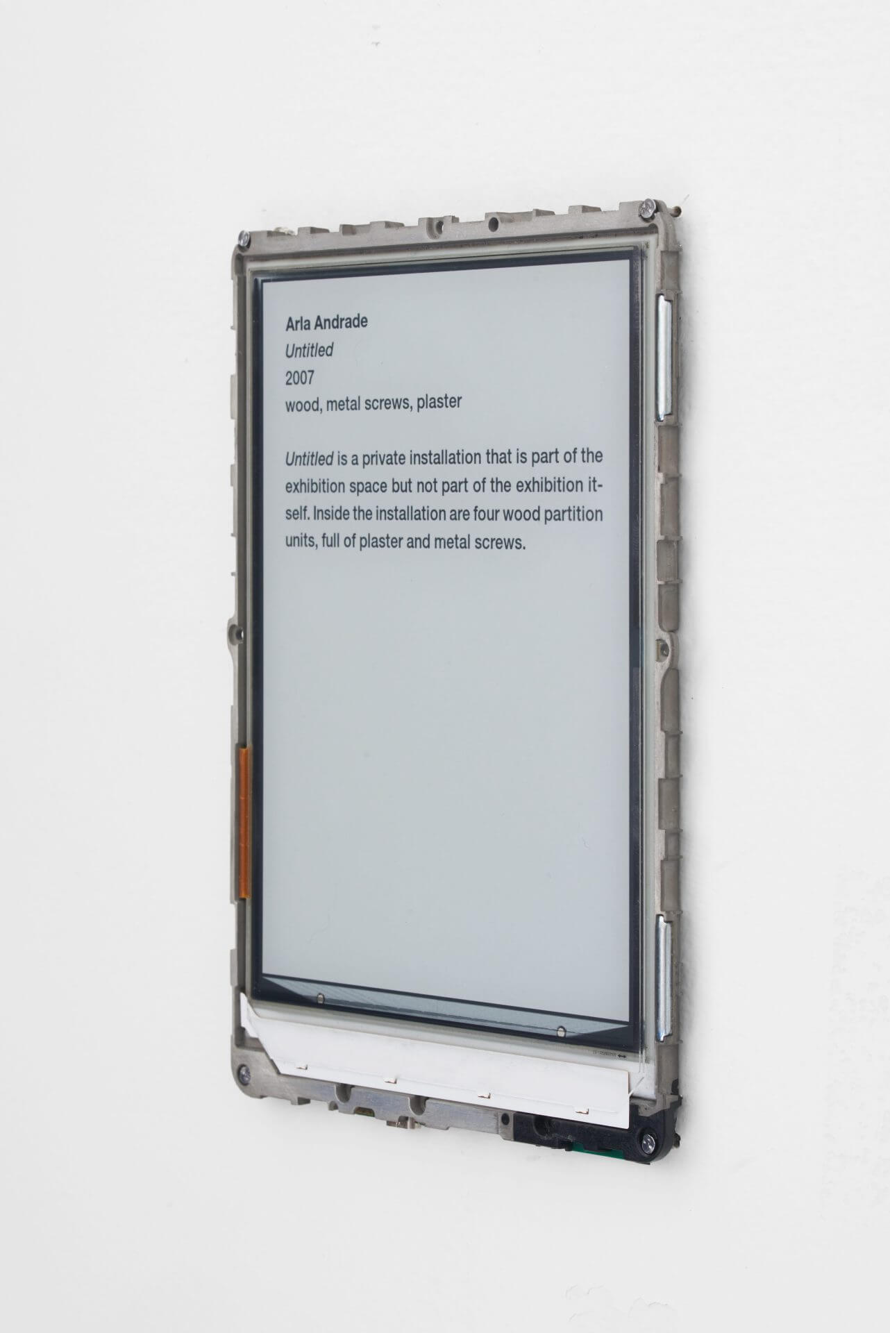 The work consists of a small e-ink screen, the size of a standard museum label, on which AI-generated captions appear one after another. All of them are produced using a custom dataset composed of textual material that typically surrounds works of art: museum labels, exhibition texts, and even audio guides for the visually impaired. The captions are completely disconnected from any actual object; they offer a plausible description of artworks with their materials, dimensions, and sometimes even their conceptual framework, but it’s up to the viewer to merge these fragments into a final mental image.