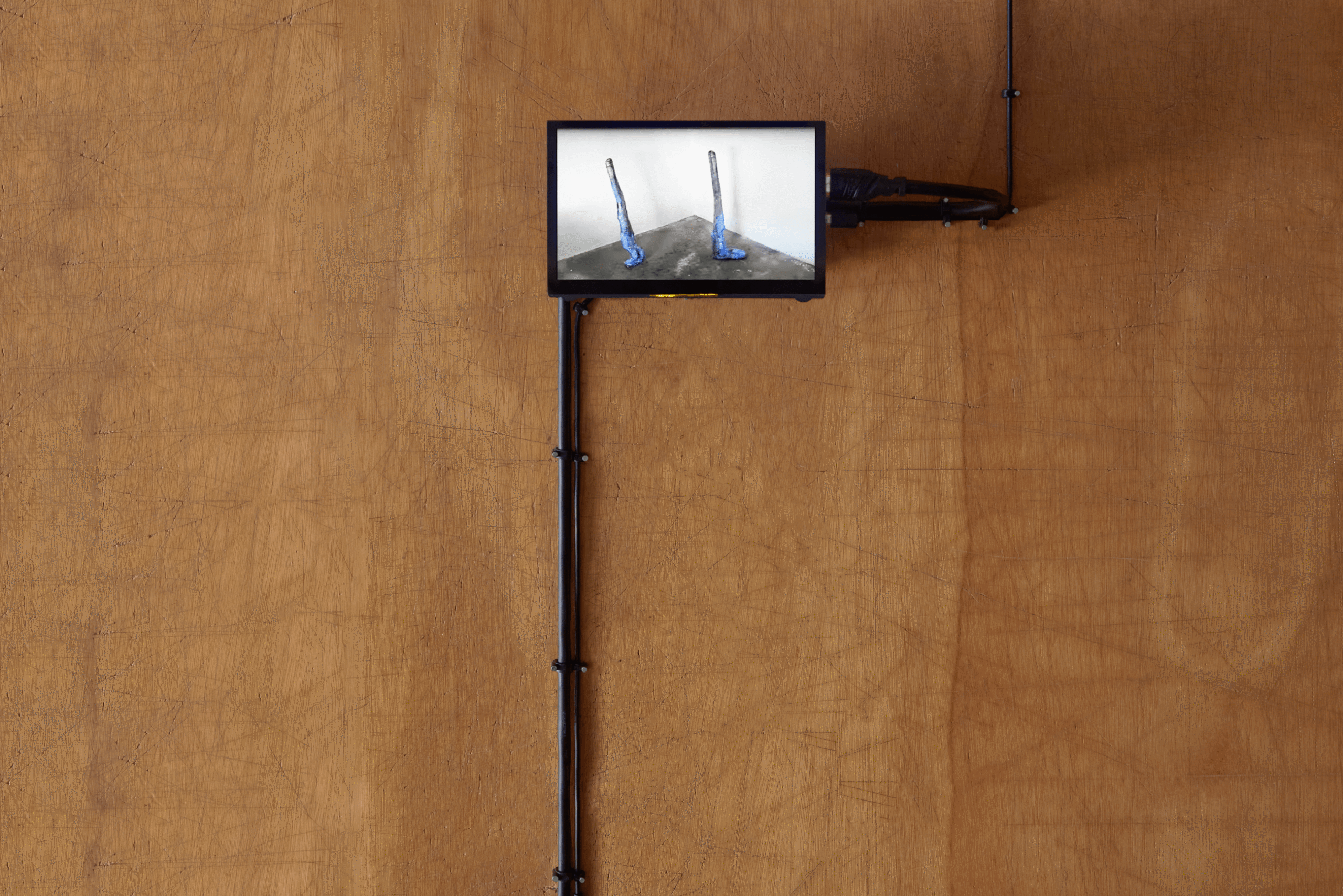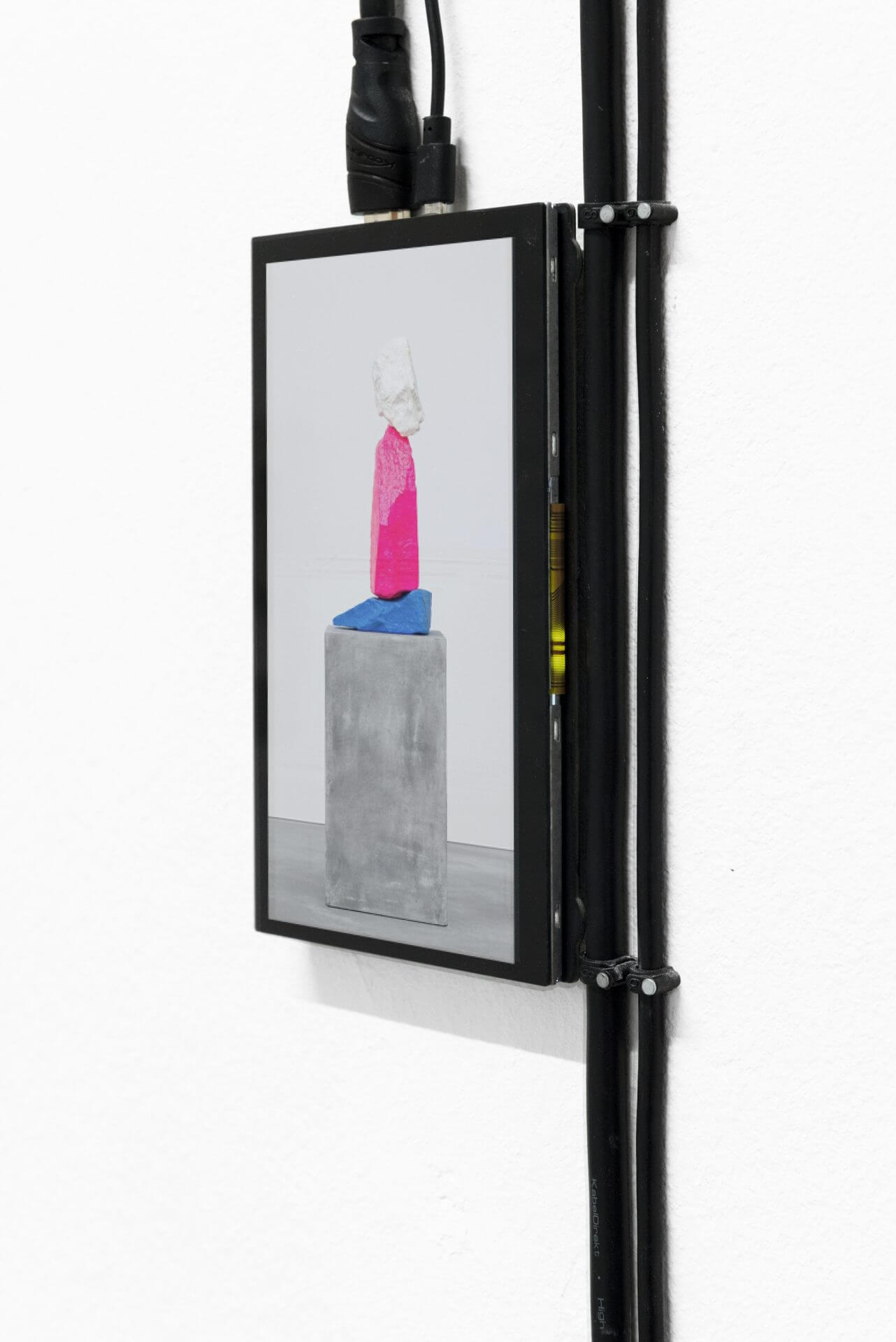 The work Dataset embodies this return to what comes before the generative model. It consists of a small screen that loops, at extremely high speed, through the thousands of images that make up the dataset used for This sculpture doesn’t exist. The images flash by so rapidly that they begin to blur into each other; the only stable elements are the white background and the grey floor, while the forms occupying the space start to merge and dissolve.