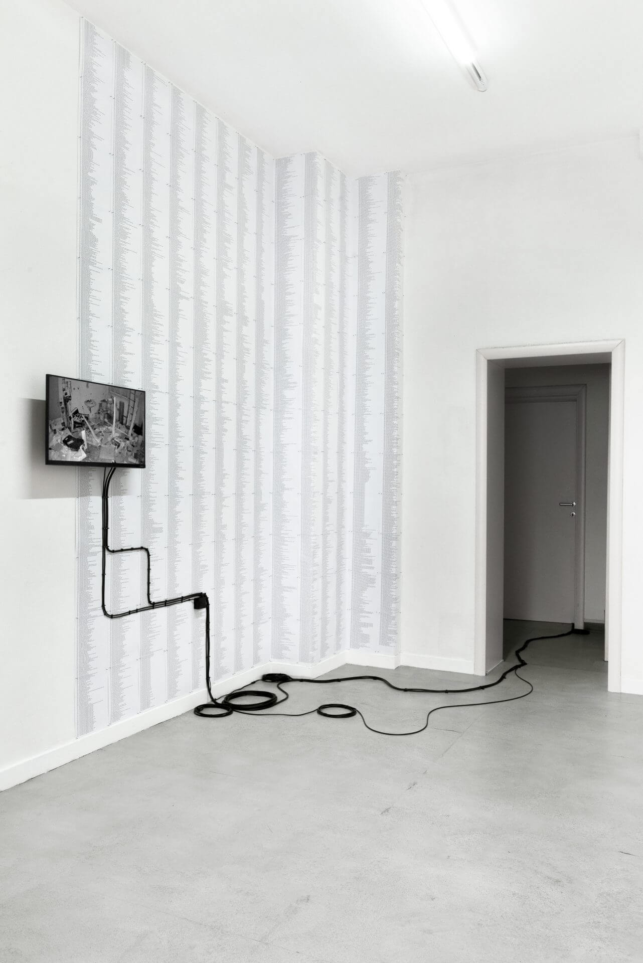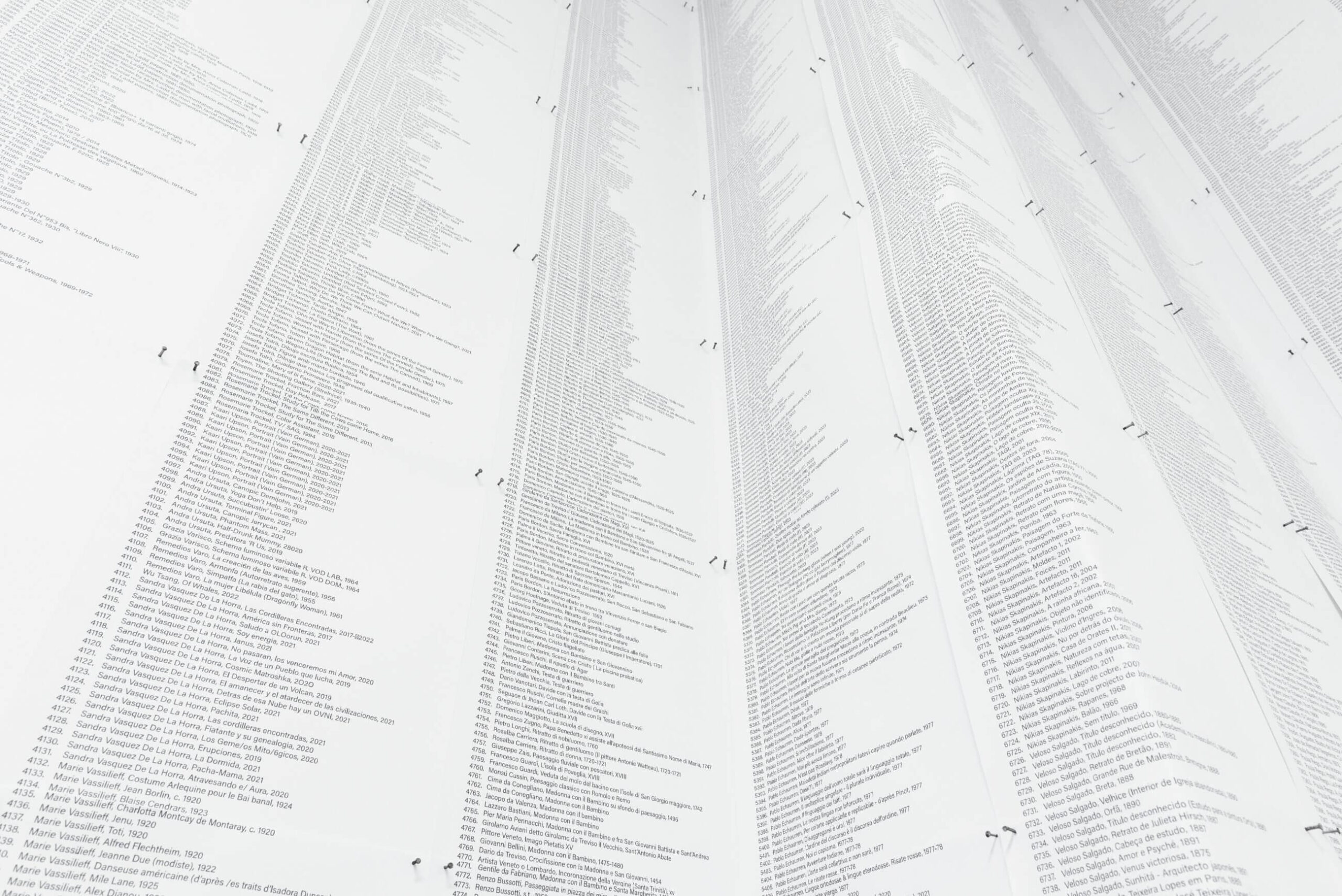 In the work I saw, I turned back to the process of building a dataset, this time through manual data scraping and accumulation, relocating those operations into the real world. Instead of relying on bots or scripts to extract data, I took on the repetitive, time-consuming task myself, keeping track of every artwork I saw in the span of a year, whether in person, in catalogues, online or on t-shirts, mugs, and billboards. The result was a list of over 12,000 items, forming a personal archive of experiences but at the same time a dataset that could theoretically be used to train an algorithm. The work was presented as wallpaper covering the walls of the exhibition space, creating a visual backdrop for the works installed in front of it.