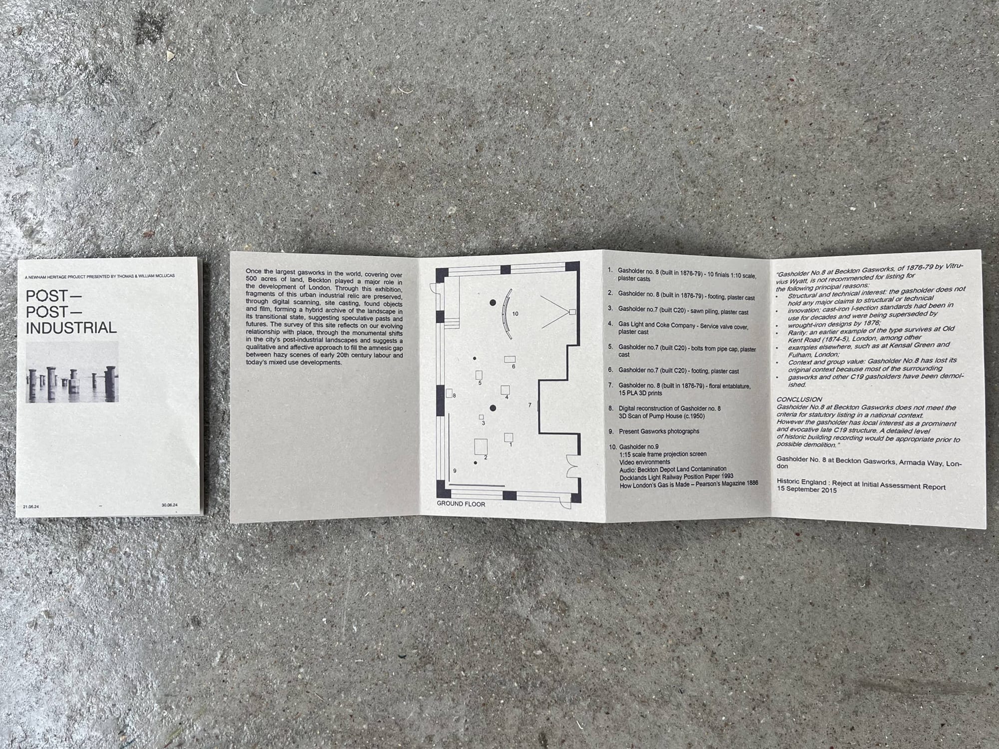 Once the largest gasworks in the world, covering over 500 acres of land, Beckton played a major role in the development of London. Through this exhibition, fragments of this urban industrial relic are preserved, through digital scanning, site casting, found objects, and film, forming a hybrid archive of the landscape in its transitional state, suggesting speculative pasts and futures.