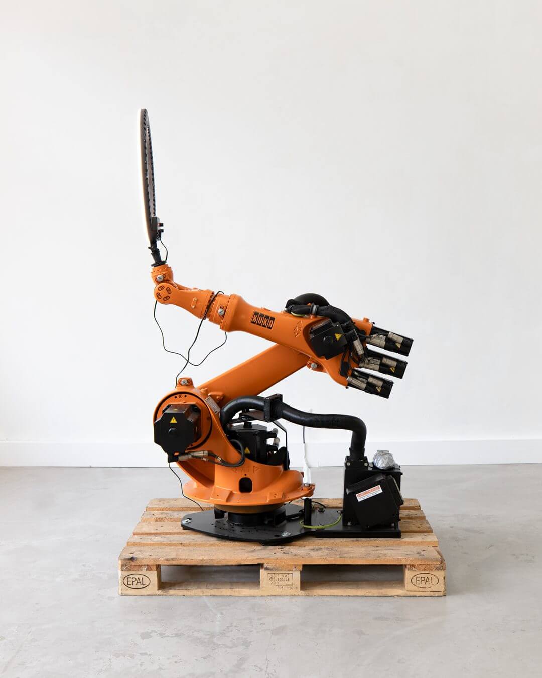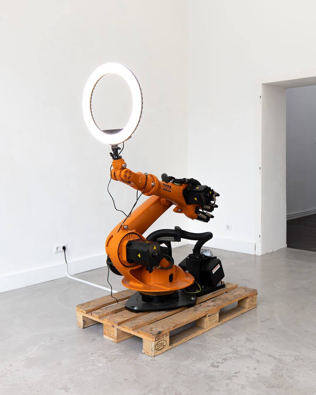 The exhibition opens with a distinct sense of suspension. The room, clinical and precisely staged, is populated by silent, semi-sentient presences: screens broadcasting elusive images, orange machines resting on wooden pallets, industrial robots adorned with ring lights mounted like profane halos. The cold lighting and sterile acoustics evoke a laboratory more than a gallery, and we move through the space with the cautious curiosity of those who fear disrupting a conversation already in progress.