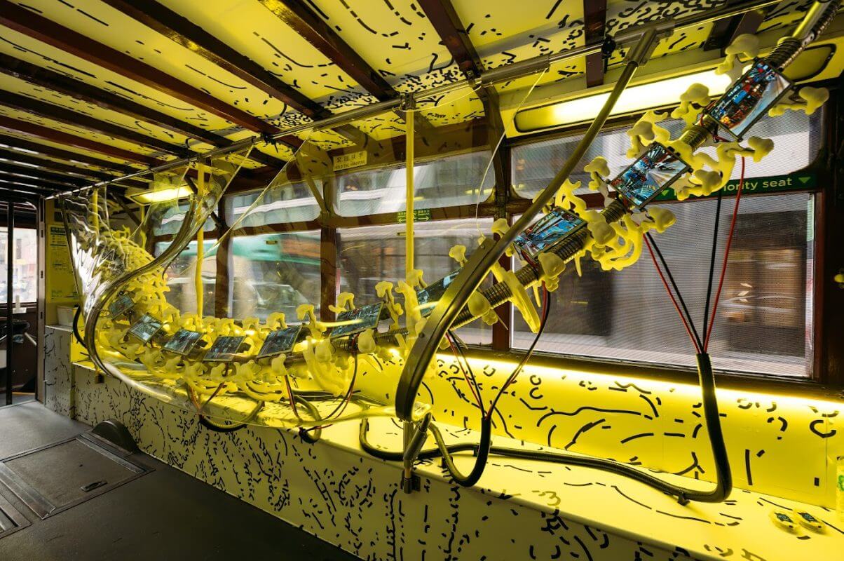 This logic extends into Defragmentation Programme on the lower level of the double-decker tram. Shaped like a spine, sixteen little screens display real-time street views. In a speculative AI future, green elements are suppressed, a sign of loss. Archival images of old Hong Kong appear intermittently. These glimpses reveal what is gradually being forgotten, disrupting perception and reminding viewers that history is never complete or objective.
