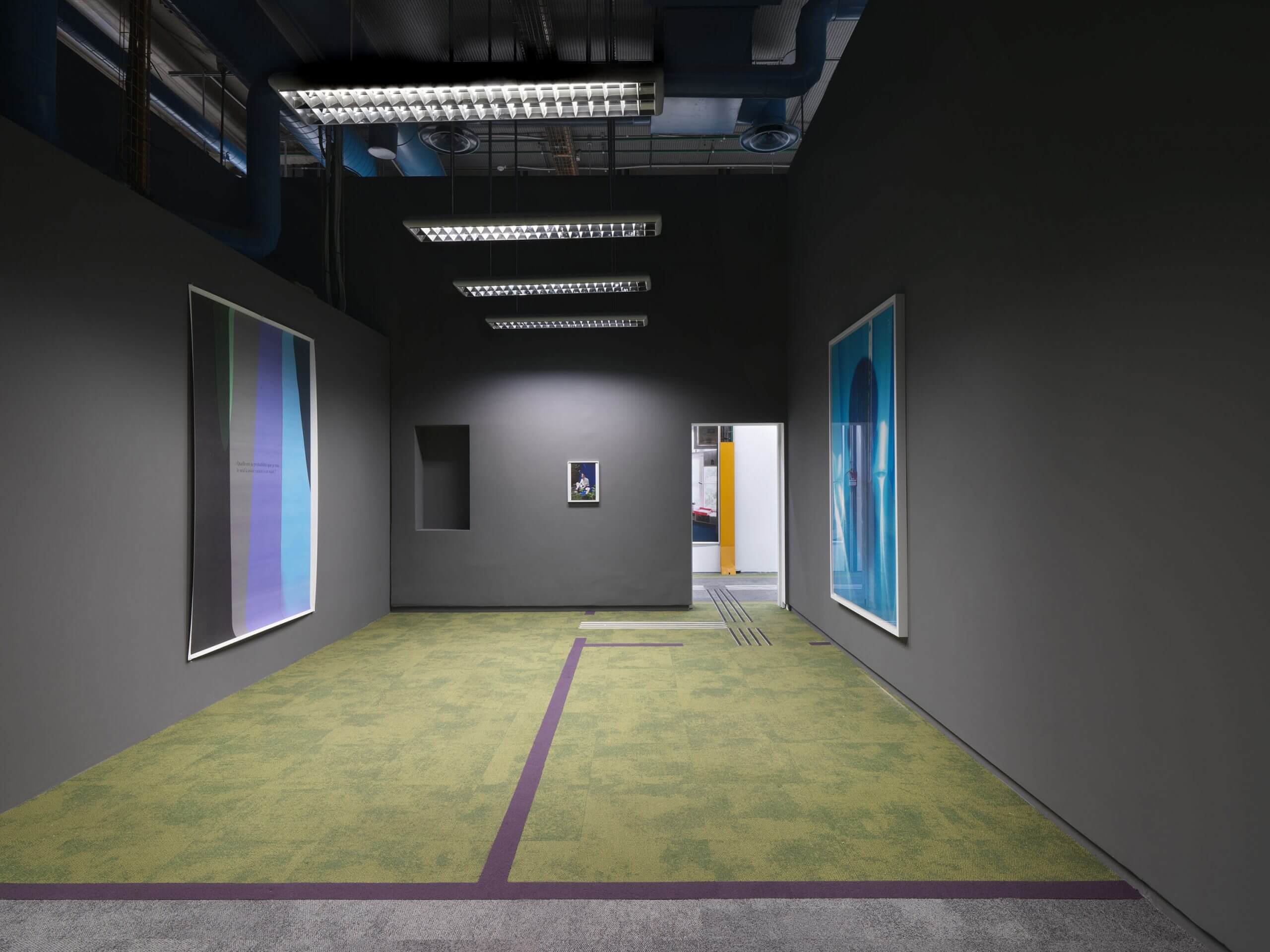 As we move through the show, surviving pieces of furniture appear as bodies in metamorphosis. Two shelves, labeled “psychology” and “philosophy of ideas,” are nearly empty. Elsewhere, in place of books, we find artworks, magazines, personal archives. A ’90s copy of i-D is taped to the back of the information desk. The gesture is both tender and iconoclastic: objects once made for function now stand as aesthetic relics. Carpets in gray, green, and violet read like abstract paintings. Hanging signs, “Politics,” “Philosophy”, now drift directionless. The library dresses as a museum; the museum dissolves into a library.