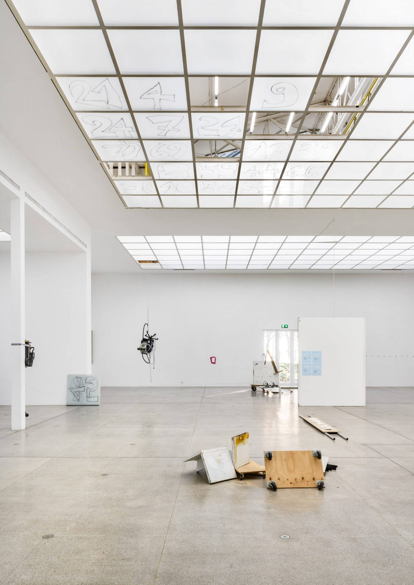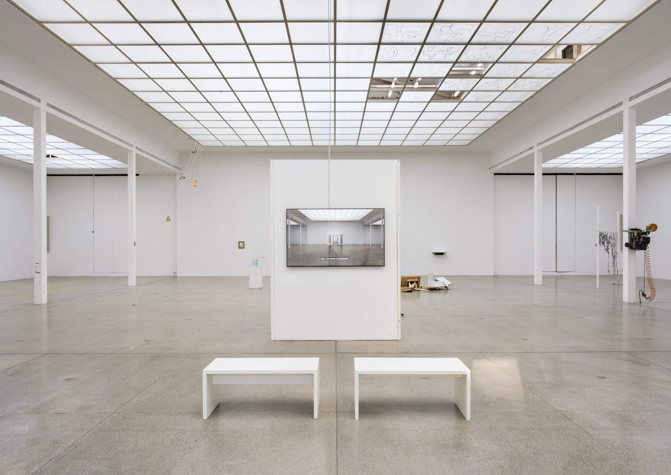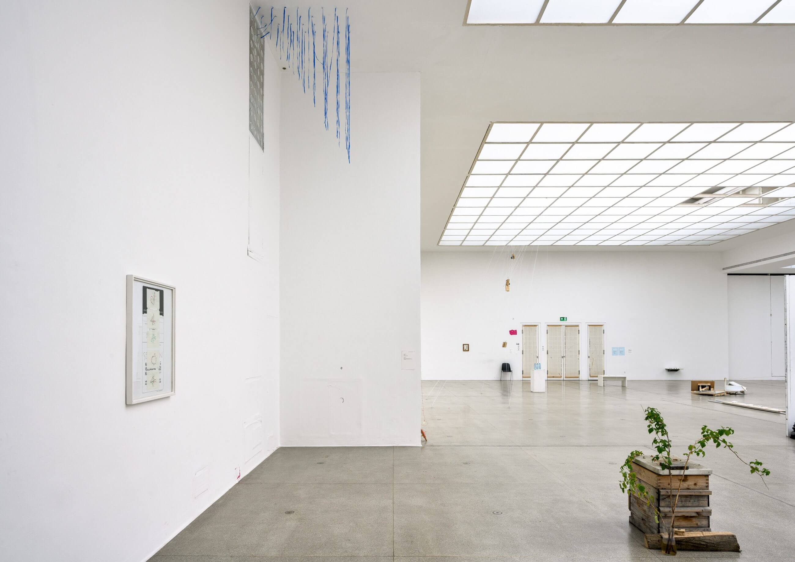 I conducted a workshop in the empty Hauptraum, for the interested members of the invited staff, about how to conceive and perform a conceptual action in a site-parasitic manner. Except for the introductory online lecture, it took place during the week prior to the opening of my exhibition. Through three assignments on diaristic, choreographic, and interventional actions, respectively, each participant was encouraged to come up with an idea inspired by what had attracted them when at work in the Hauptraum, carry out the action to directly approach them, by using materials, objects, and tools found in or around the space, including the basement workshop and their own pockets and bags, and leave the direct outcome where they were generated. I also contributed a spontaneous piece. All the resulting objects and situations remained and formed a group exhibition inside my solo exhibition, which I called Big White Playground.