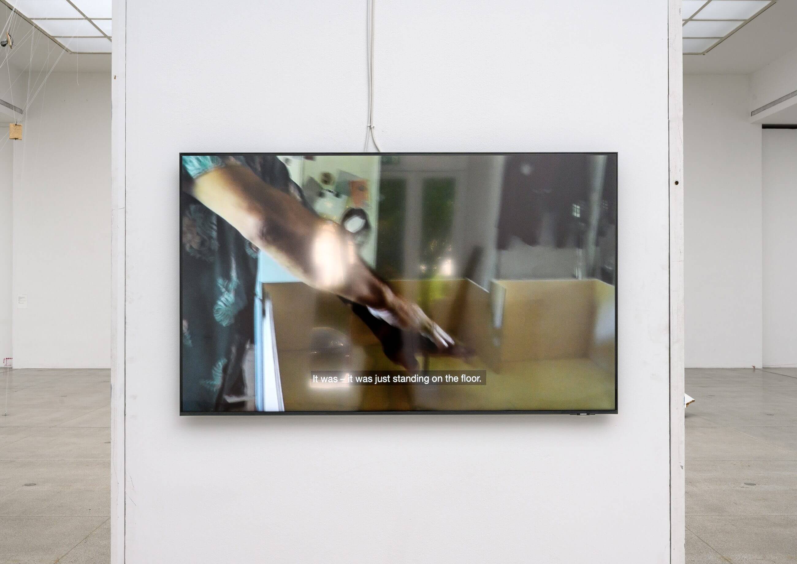 There was, however, one clearly theatrical aspect involved. In my exhibition at the Hauptraum, the resulting video was presented as an audio-visual installation unfolding throughout the entire space, with its audio, Willi’s voice, reverberating everywhere, from four special loudspeakers installed at the far corners while the imagery of the video was only visible once you reached the rear part of the space and turned back to the flat screen placed behind a standing wall. With this setting, I intended a certain effect: making the visitor feel as if the space itself were talking to them. It worked very well. But looking back, was it worth breaking the rule of only using found items, by renting the special sound equipment from outside, even though it was the sole exception? Well, I have no regrets anyway, this deviation was driven by my pure curiosity about how it would turn out, and I really wanted to experience it firsthand.