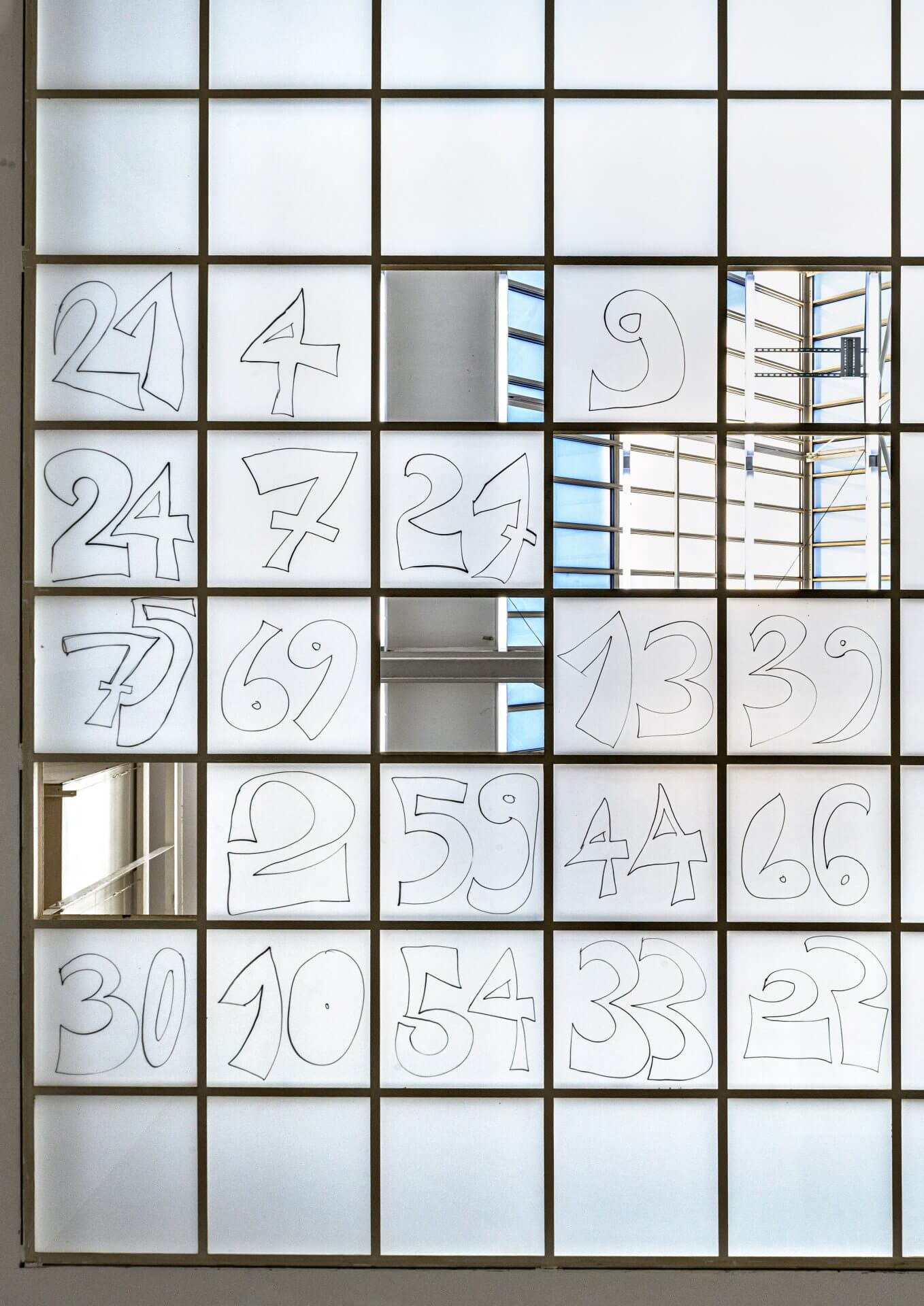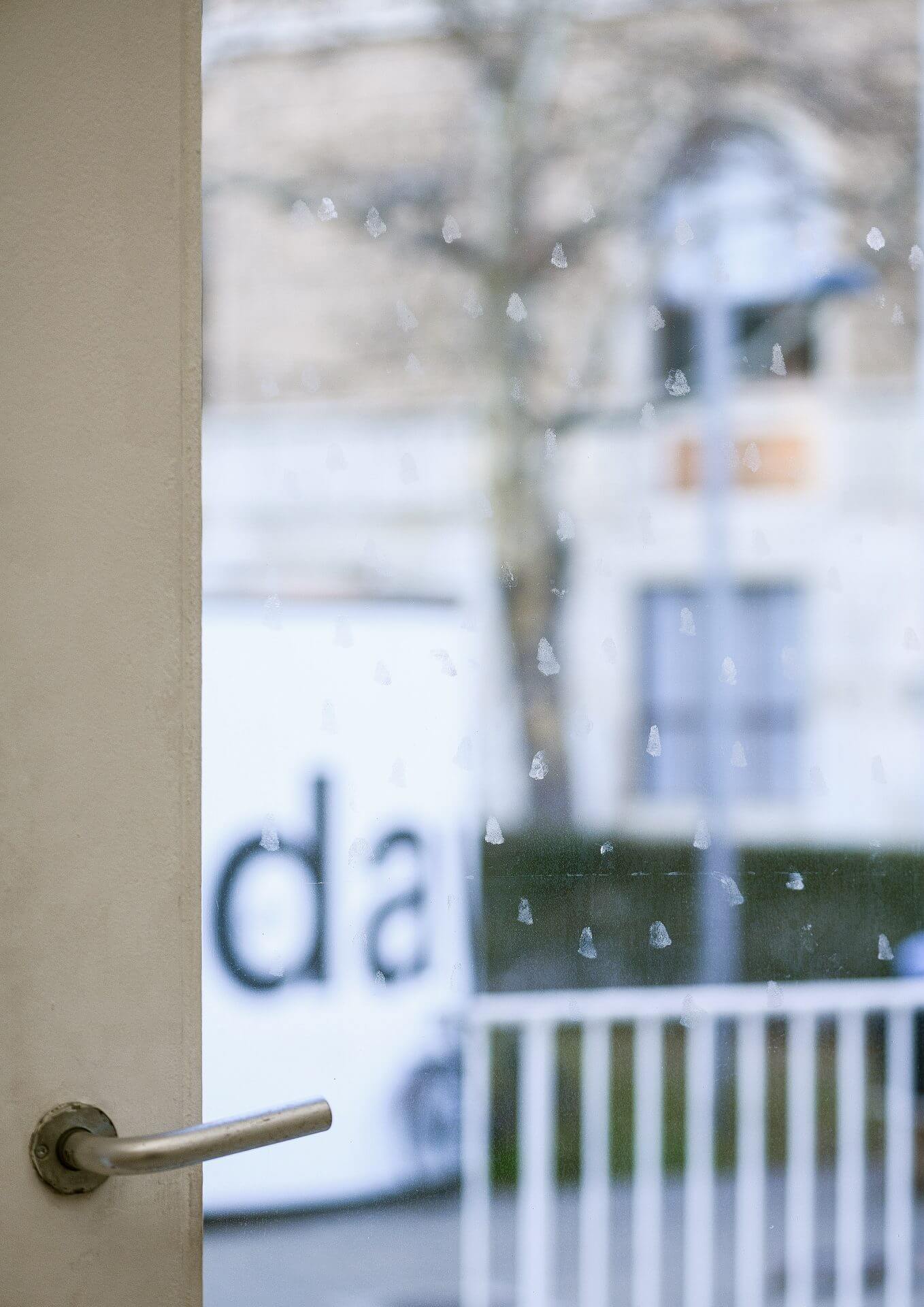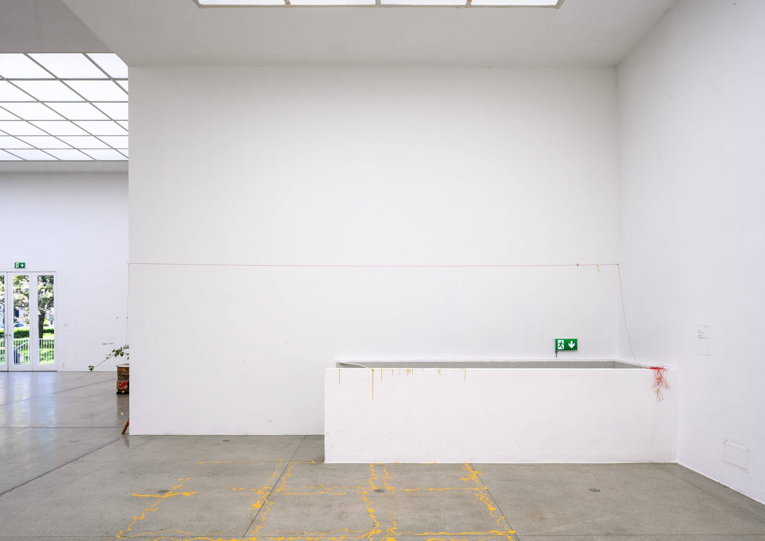 The actions conceived and performed by the participants include the following. The cleaner Emine Koza pressed her nose to the glass pane of the rear exit of the space, once per day and for a month, leaving unique prints of her natural nose grease with somewhat regular intervals, inspired by her daily erasure, for nearly four decades, of the nose prints of curious visitors who look out. The installer Márton Zalka poured found yellow paint along the edges of each square of the ceiling grid, letting gravity transfer the shapes onto the floor, in response to his fear of heights when changing neon lights up there as part of his job. The educator Grzegorz Kielawski did an ongoing work throughout the show’s run, stacking Austrian 50-cent coins, which feature the Secession building’s iconic ‘golden cabbage’ on the tails, according to how much he earned while staying in the Hauptraum during each of his guided tour covering the entire house, based on his hourly fee. The guard Mario Batram, each time he shifted his position to or from the Hauptraum, rolled a cigarette with various materials, including Secession-related prints, and smoked it where he usually does, outside, right behind the space, simultaneously whistling a song he likes.