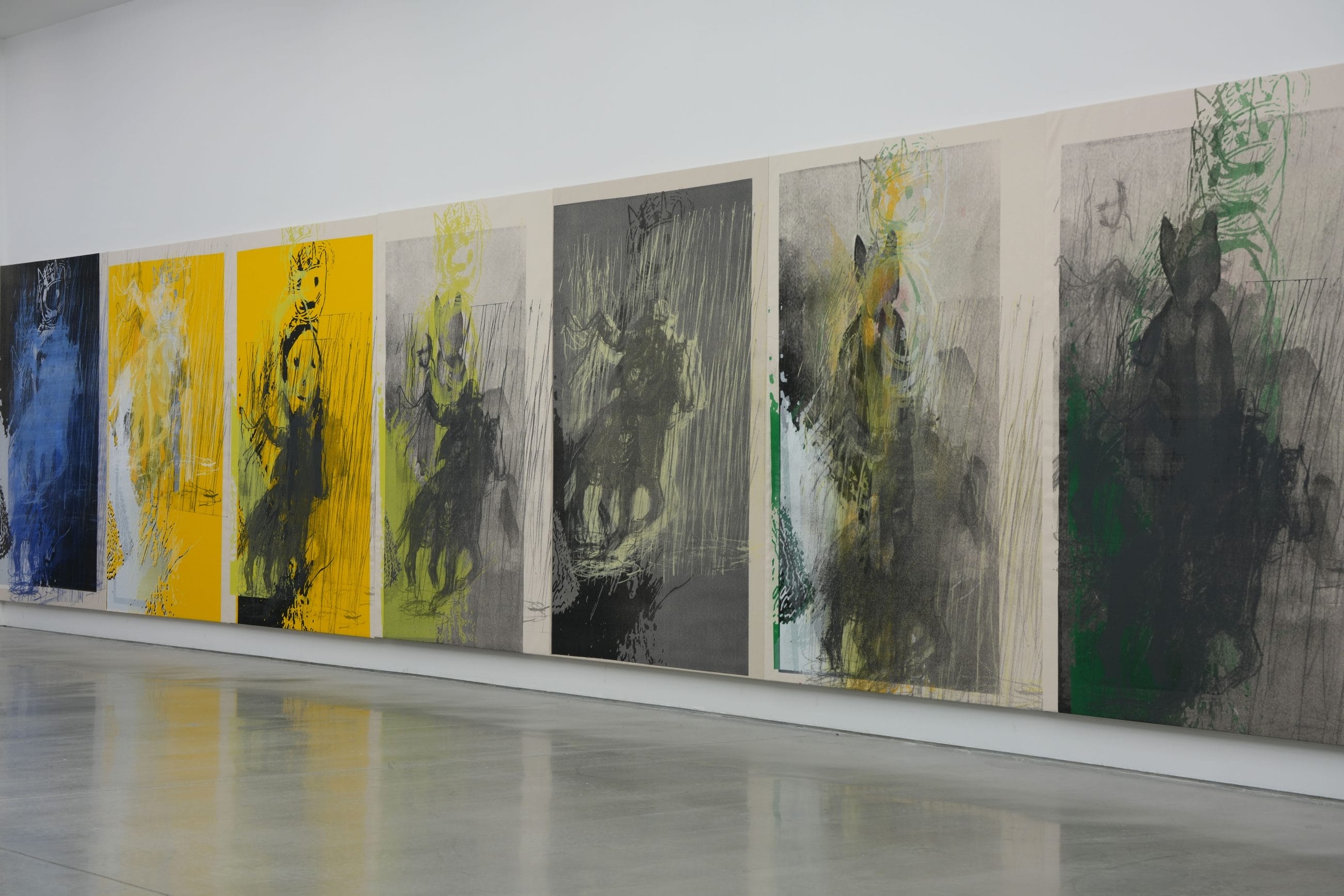 Eighteen works on paper, plus one solitary painting; not a coherent corpus, but a living body. Vibrant, shaken, electric. The gallery space holds its breath as color shatters, condenses, and dissolves along the walls like a film sequence with erratic frames. Each panel is a frame. Each frame, a risk.